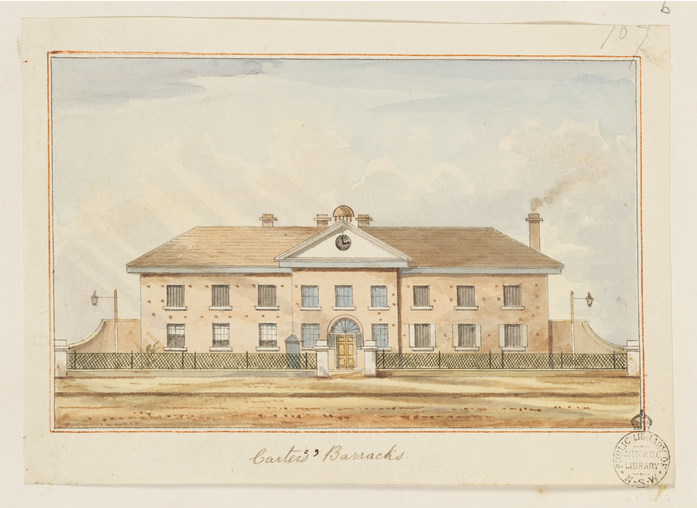 Within a year, Thomas left the Yards and was appointed Assistant Superintendent at Carters’ Barracks.[17] The Barracks, which had originally housed convict gangs working on the brick fields as carters and brickmakers, was principally a juvenile penal institution, although it ceased to house boys in 1834.[18] Thomas, Sarah and their four children probably lived on site, as Thomas was provided with ‘quarters at the establishment’ in addition to his annual salary of £91.[19] The Barracks was situated near what is now Sydney’s Central Station, bounded by the Sandhills Cemetery, the Benevolent Asylum and the Hay and Cattle Markets, effectively isolated from urban encroachment.[20] Although the area was far from salubrious, the Barracks itself was a grandiose Georgian building that did not appear (at least from the outside) to be a prison.[21] Historian Cameron Nunn has described the layout of the Barracks, which helps us picture where the Bell family may have lived. The U-shaped building was divided into three distinct sections; the northern end consisted of stables capable of accommodating 90 horses; the middle section contained offices, dormitories, a mess hall and kitchen, and accommodation for convict supervisors; the southern end housed a schoolroom and workshop.[22]