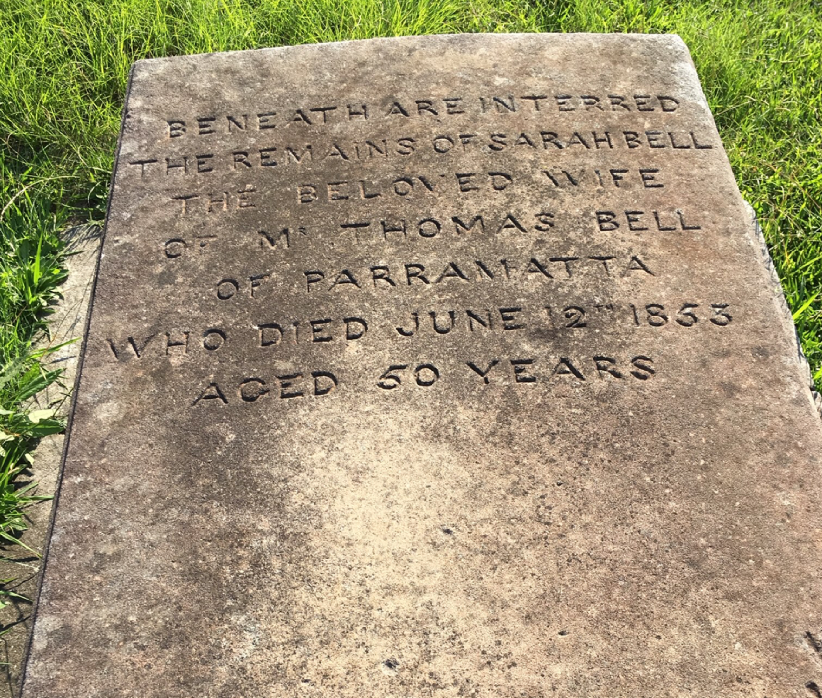 [1] According to an inscription in the Bell family bible, Sarah was buried in “Captain Moffatts [sic] tomb in St. Johns Burial Ground.” The bible is held by Anita O’Connor, a descendant of Sarah Bell. The plot is thought to have been purchased by Captain Robert Gerald Moffatt, who had been a magistrate in Parramatta between 1834 and 1843. Moffatt, whose nephew married Sarah’s daughter Mary, died on the Darling Downs in 1848 and was buried there, leaving his burial plot available. Sue Bell, “Thomas and Sarah Bell,” Bicentennial Publication, (Parramatta: Parramatta Female Factory Friends, forthcoming 2020).