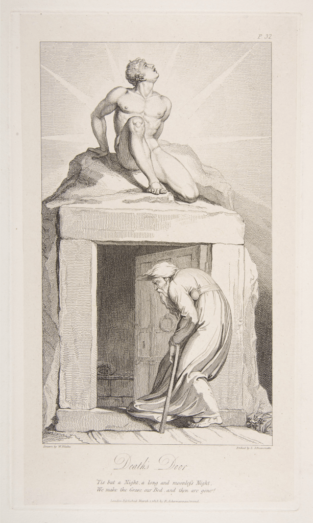 In his latter years, Reverend Samuel Marsden was so preoccupied with the fleeting nature of life, death and salvation that he ‘entered on the subject of death with feeling’ on more than one occasion with colleagues.[1] He could hardly have escaped such thoughts. In his role as parson, he had presided over the rituals surrounding the beginnings and endings of countless lives within his parish of St. John’s, Parramatta, and recorded them in the parish register for decades, and, in his capacity as Chief Cleric, he had dutifully collated those figures along with those gleaned from other parishes to keep the Mother Land—‘Home’ with a capital ‘H’ as he continued to think of it—well informed about the state of her colony.[2] On a personal level, too, like the old man stooping to enter ‘Death’s Door’ in William Blake’s illustration, he was inevitably facing his own mortality, made all the more real following the loss of his beloved wife Elizabeth in October 1835, and the sight of her grave every time he looked out his study window at St. John’s Parsonage.[3]